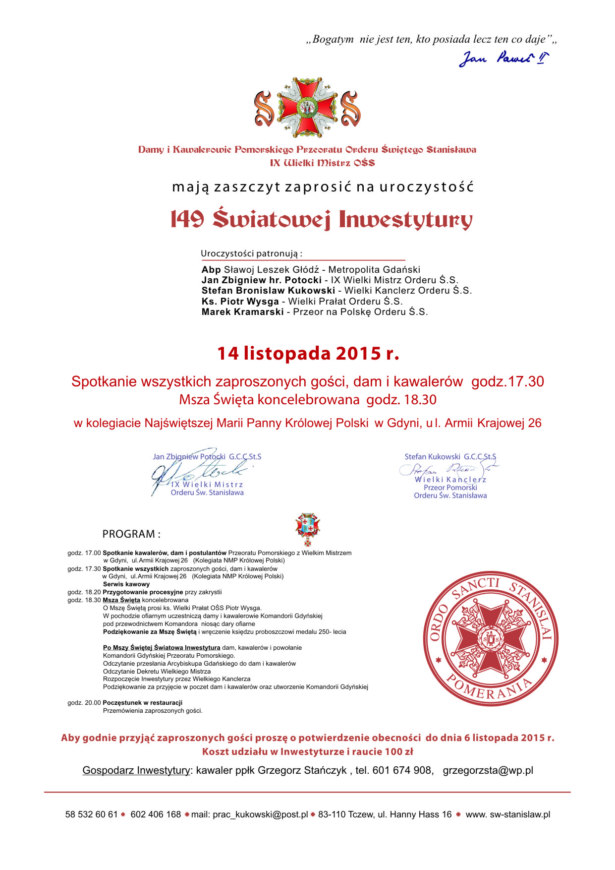 W dniu 05.07.2017 roku o godzinie 12:00 w Auli im. Lubrańskiego Uniwersytetu Adama Mickiewicza w Poznaniu został podpisany Akt Zjednoczenia Organizacji Orderu Świętego Stanisława B. M. Wraz z podpisaniem Aktu Zjednoczenia oraz powołania X Wielkiego Mistrza OŚSBM Kawalera dr Mariana Króla w obecności sygnatariuszy Aktu Zjednoczenia Kawaler Jan Zbigniew hr. Potocki pozostaje dożywotnio IX Wielkim Mistrzem Seniorem Orderu Ś.S.B.M. W uroczystości brali udział przedstawiciele Przeoratu Łódzkiego w osobach: Kawaler Stanisław Syguła i Dama Mariola Palińska.